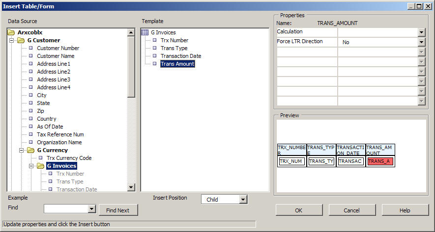 To add data items from the XML file into your report, you locate in the document the placeholder for the field you're going to add, highlight it and then select Insert > Field from the toolbar. A dialog box comes up with all of the available data items, you select the one you want and then press OK, like this: