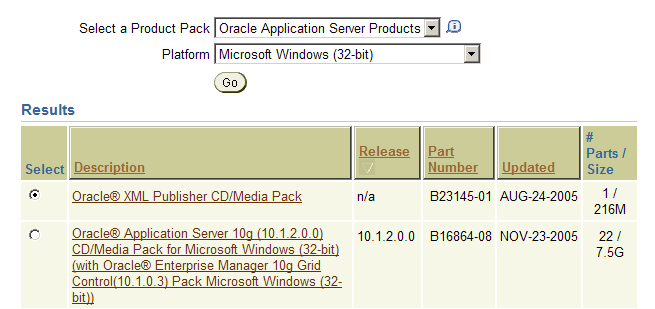 For anyone not familiar with XML Publisher, it's the new reporting technology that originally surfaced as part of E-Business Suite and is now available to license as a separate product. If you're interested in getting hold of a copy, you can download it from http://edelivery.oracle.com - first select Oracle Application Server Products, then select your platform, then locate the XML Publisher CD Pack, as below: