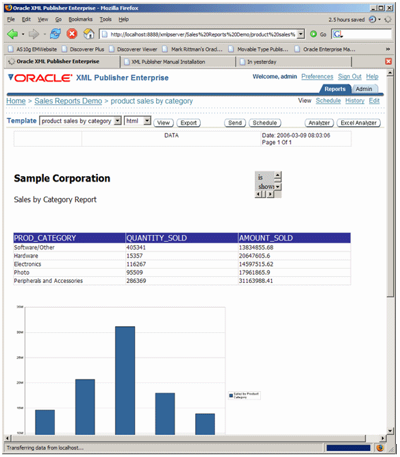 The data I require is in the SH sample schema that ships with Oracle 9i and Oracle Database 10g. As all of the work goes on at the XML Publisher end, it doesn't matter what version of Oracle you're using and there's no need to use Oracle Application Server - OC4J 10.1.2 or 10.1.3 is all you need, as well as XML Publisher 5.6 of course.