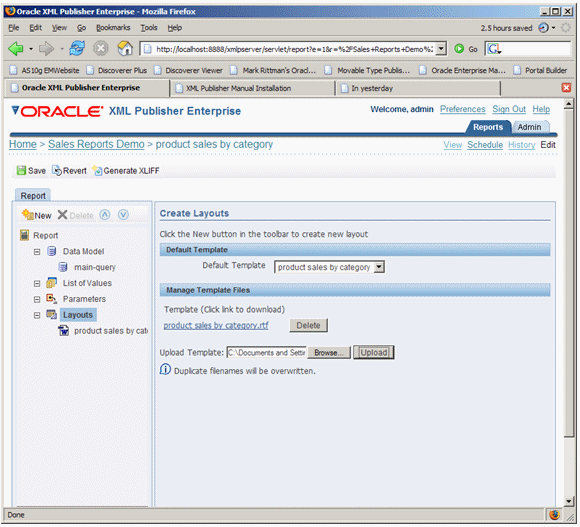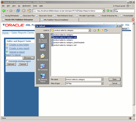 Logging on to XML Publisher Enterprise as the admin user, I first created a new folder called "Sales Reports Demo" and then uploaded the file with an ".xdo" suffix that the SQL Report Wizard had created for me along with the RTF template file. The .xdo file brings together references to the dataset, the templates that use it, and any parameters and their associated lists of values. The uploading process looked like this: