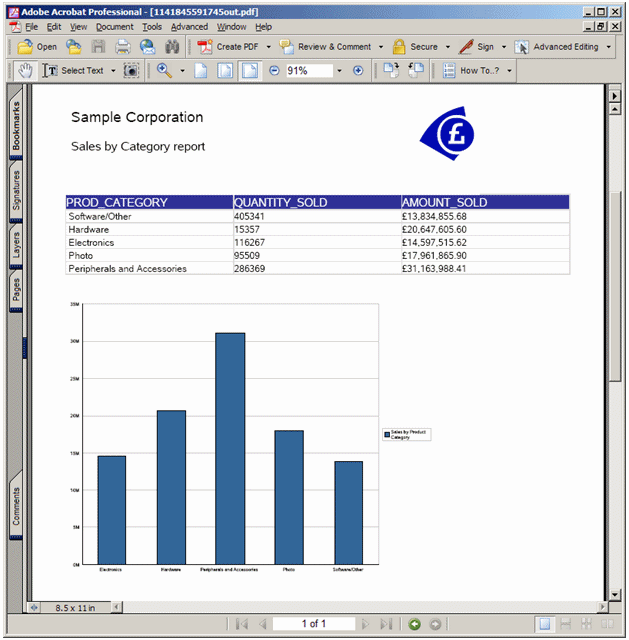 Next up was Query #3, sales by product category. This is a report based off of an SQL data source, which was possible in XML Publisher 5.5 but only in a very basic manner. I was keen to find out how this had developed with version 5.6.