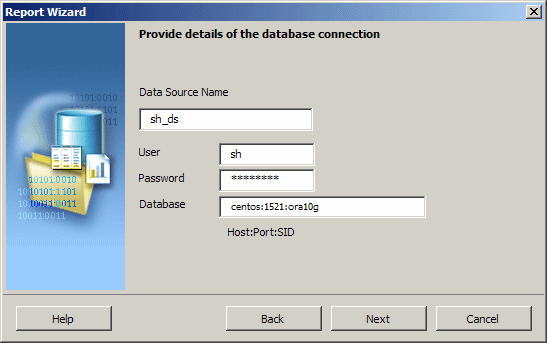 Using this menu item brings up a wizard that steps you through the process of defining an SQL query. It's a bit more user-friendly than the 5.5 release in that it first prompts you for the datasource name, then the connect details, and then the SQL that retrieves the data, but it still requires you to have put the SQL together beforehand and there's no GUI query builder as you get with Oracle Report Builder.
