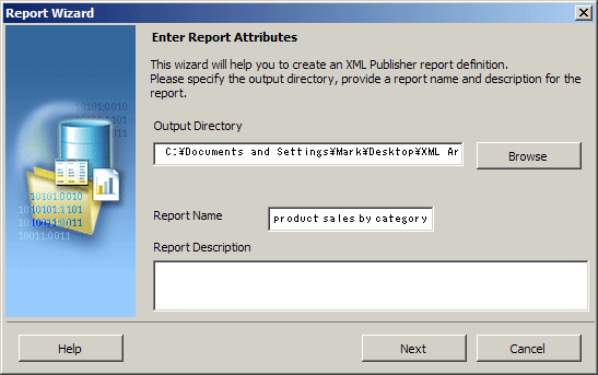 The first step then is to obtain the data for the reports. A difference between XML Publisher and OracleBI Discoverer is that with Discoverer, you use the workbook wizard to interactively query the end user layer and then obtain a dataset for later analysis, whilst with XML Publisher to generally obtain the dataset before you use the product, which you then use to publish your data. XML Publisher 5.6 can report on data that comes from one of three sources - an SQL query via JDBC, XML over HTTP (using GET or POST), or XML via a Web service. If you're going to use an XML datasource you need to get an extract of your data as either an XML document or an XML schema, so that you can use the elements in the extract to lay out your report template.