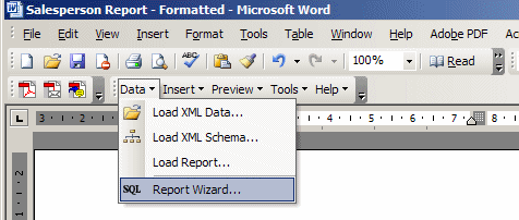 Starting up the Word add-in again, this time I selected a new item in the Data menu, "SQL Report Wizard":
