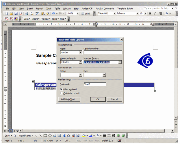 Once you've run the wizard, you end up with the first draft of the template, as an RTF file, which you can then change the colour and font of, add pictures in the form of GIFs, PNGs, JPGs and Word clipart, and by double-clicking on the field, change the format to a currency, number or other text format.