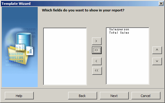 Once you've brought the XML data in, you now want to produce a report that contains a table with repeating rows of salesperson sales totals. In 5.5 you used a dialog that let you build up the table by dragging nodes from the hierarchically-arranged dataset, but with 5.6 there's a table wizard that steps you through the process, much like you get with Oracle Reports Builder. The wizard lets you pick what data items to include in the table, what fields you group the data on, what fields you sort by and what labels you use for the column headings.