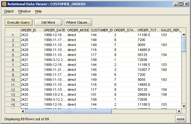 2422 16-DEC-99 10.19.55.462332 PM direct 144 2 11188.5 153 2424 21-NOV-99 12.22.33.263332 PM direct 146 4 13824 153 2425 17-NOV-98 01.34.22.162552 AM direct 147 5 1500.8 163 2428 10-NOV-99 04.41.34.463567 AM direct 116 8 14685.8 2429 10-NOV-99 05.49.25.526321 AM direct 117 9 50125 154 2430 02-OCT-99 06.18.36.663332 AM direct 101 8 29669.9 159 2421 12-MAR-99 09.53.54.562432 PM direct 109 1 72836 2426 17-NOV-98 02.22.11.262552 AM direct 148 6 7200 2428 10-NOV-99 04.41.34.463567 AM direct 116 8 14685.8 2429 10-NOV-99 05.49.25.526321 AM direct 117 9 50125 154 2430 02-OCT-99 06.18.36.663332 AM direct 101 8 29669.9 159ORDER_ID ORDER_DATE ORDER_MO CUSTOMER_ID ORDER_STATUS ORDER_TOTAL SALES_REP_ID PROMOTION_ID L