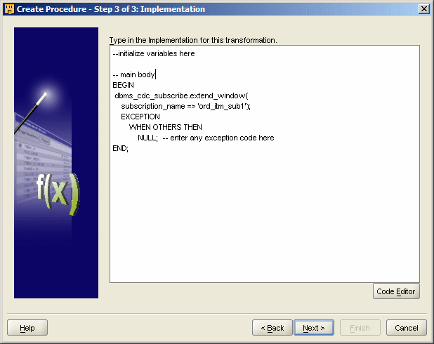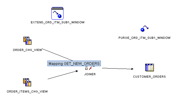 It's fairly straightforward actually, now that the hard work has been done outside of the tool. The way that we'll integrate it with OWB is firstly, to import the two views (ORDER_CHG_VIEW and ORDER_ITEMS_CHG_VIEW) into OWB, and then create two procedures to firstly extend the subscription window, and secondly to purge it. Then, we'll create a mapping, bring the two source views into the mapping, join them and use them to load into our warehouse staging area, and add pre- and post-mapping procedures into the mapping to call the window extending and purging.