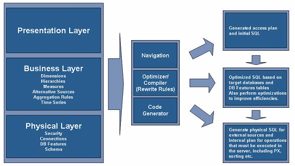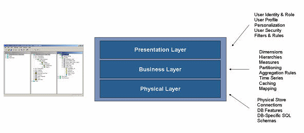 The Enterprise Semantic ModelThe Analytic Server holds its metadata about the data it can connect to, in a repository. This repository consists of three layers; a physical layer, that provides information about the databases and other data sources that the analytic server can connect to; a business model and mapping layer, which contains logical tables, columns and mappings, together with business constructs such as dimensions and measures; and a presentation layer, which contains user views of the business layer.