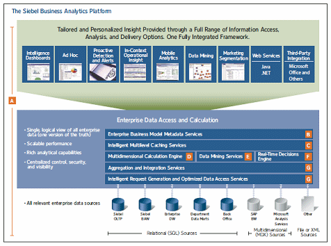 At the heart of the Siebel Analytics Platform, and now Oracle BI Suite Enterprise Edition, is the Analytic Server. This is a "business intelligence application server" that provides a platform for Siebel Answers, Siebel Intelligence Dashboards and the other query tools, adds business and presentation metadata, retrieves data from source databases and then caches and post-processes the results before presenting the results to the query tool.