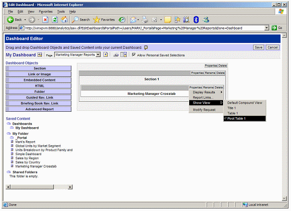 Then, it's a simple job to click on the marketing manager reports tab, and add the second report to the dashboard. Make sure you select Pivot Table as the view over your data, so that it shows the crosstab and the graph that you added.