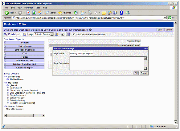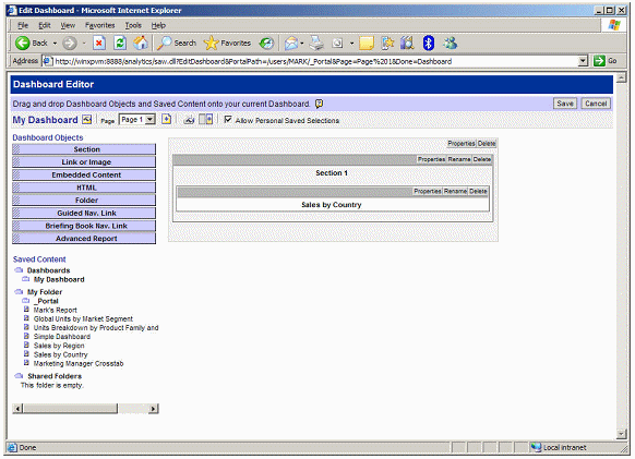After clicking on the link, you drag "Sales by Country" from the available reports pane onto the dashboard.