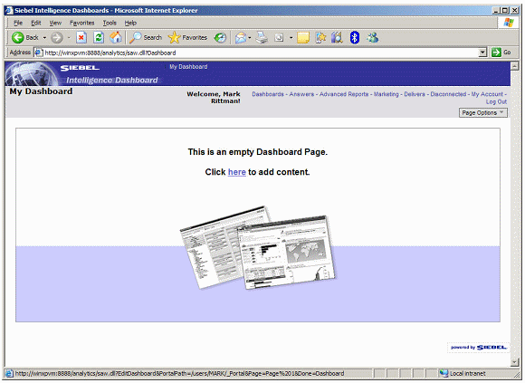 As this is your first dashboard, you are presented with the default, blank page that invites you to add some content.