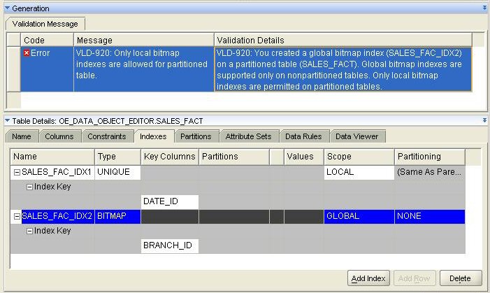 Indexing is set up using the Indexes tab in the Data Object Explorer. Setting up an index involves selecting the index type (unique, non-unique, bitmap or function-based), it's scope (global or local) and the index partitioning, which will either be automatically set to be the same as the "parent" column if it's local in scope, or you can select from none (the default), range, hash or hash by quantity if the scope is global. As it can come sometimes tricky to remember which index types are valid for global and local scope types, and in general what the rules are around indexes and partitioning, running a validation on the object is usually a good step as it usually offers some good advice on what's allowable and what's not.