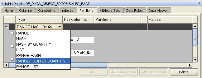 The tab also supports the more exotic partitioning schemes, including composite (range-hash, range-list), and also has partition types of "hash by quantity" and "range-hash by quantity" - these aren't new partitioning schemes as such, they're a shortcut provided by OWB to help you quickly define a hash partitioning scheme by just specifying the number of hash buckets you require, and the column to hash on. You can then configure the partitions to share the same tablespace list.