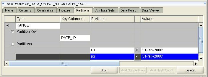 If this is a big table, or one that we want to be constantly available during a data refresh, or perhaps one that will feature a lot of concurrent access, then we'll probably want to partition it. Partitioning is defined using the Partitioning tab in the Data Object Editor, and in this case, we are going to range partition on the DATE_ID column.