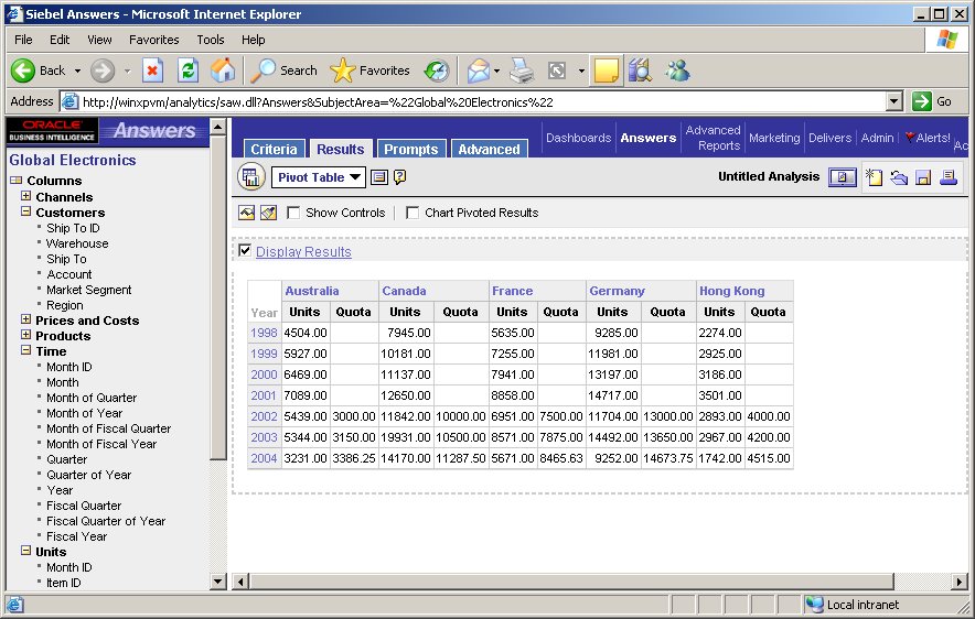 Just to recap, what I've done here is say that the Warehouse and Year columns in their logical tables have in fact two sources - the Global Sample Schema tables, and my Excel spreadsheet. Then, when I bring the data together by requesting both Units and Quota data, the BI Server will go away and get the data from both sources, and join them together on the way out.