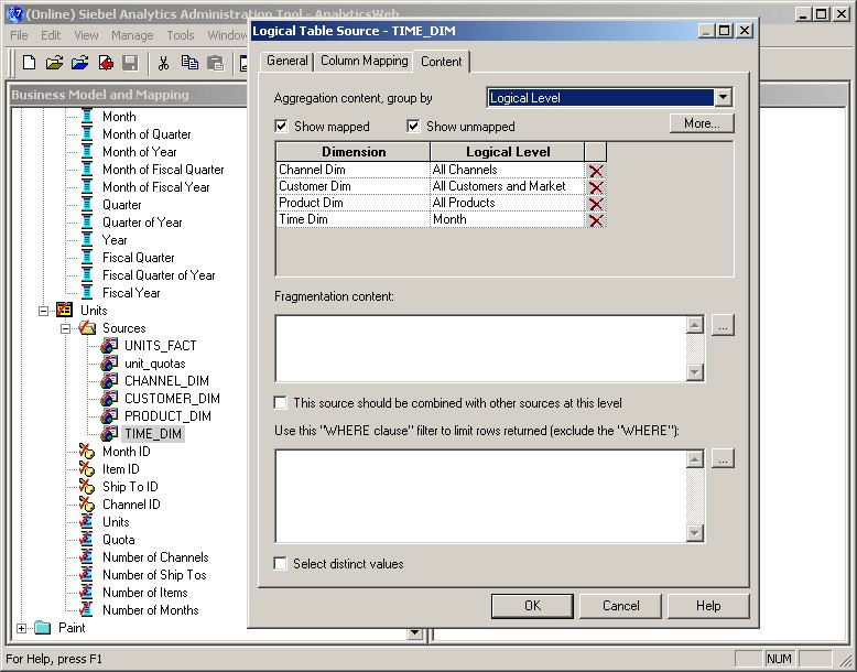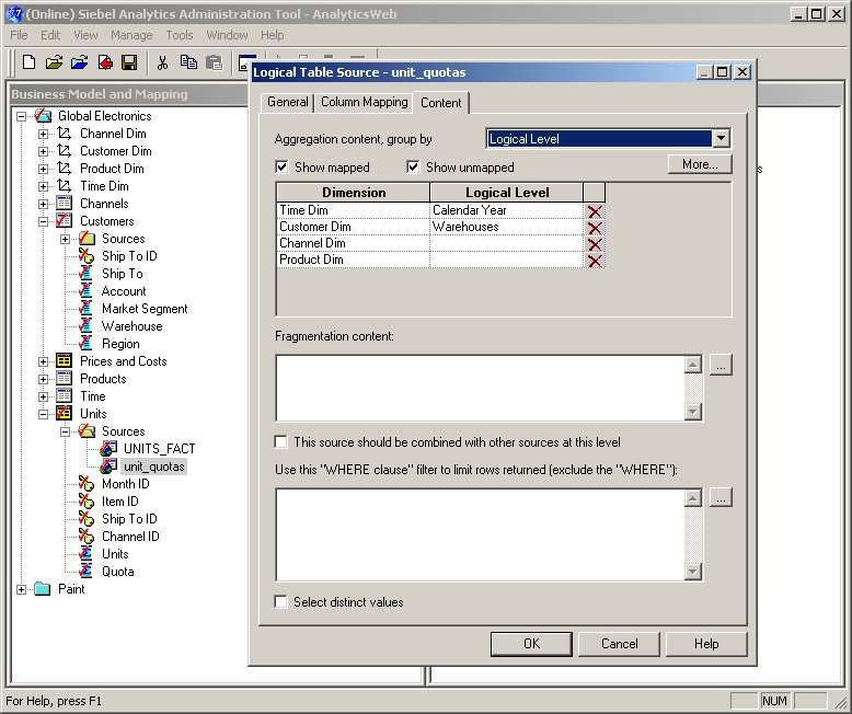 The next step is to drag the Quotas column from the Global Quotas physical "table" and drop it into the Units logical table. Then, because the quota data is only at the warehouse and year level, not available for all levels of aggregation or all the dimensions, I need to edit the logical table source and say what are the lowest levels of aggregation it (the quota column) is available for, like this: