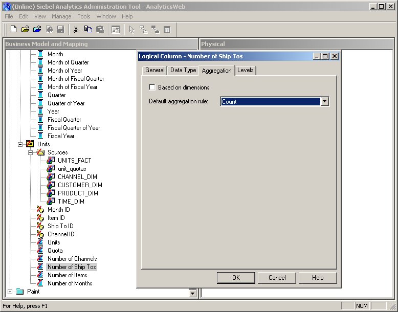To get around this problem, there's one further step to do that seems a bit strange at first, but sets up the business model metadata so that you can browse the time dimension properly again. The first step is to go back to the Administration tool, and copy the lowest level from each dimension - Item, Ship To, Channel and Month - into the logical fact table, change the aggregation type to COUNT (any aggregation will do), then change the names to reflect the aggregation type, ending up with a fact table looking like this: