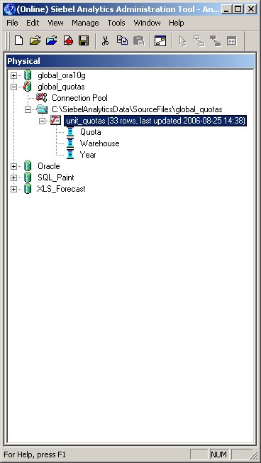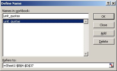 Unlike the Oracle database and it's external tables, BI Server can access Excel spreadsheets directly using ODBC, with Excel presenting worksheet named ranges to the ODBC driver as regular tables which the BI Server can then select against (technically, Oracle can access Excel through ODBC, but it's complicated to set up and most people save to CSV and access through external tables instead). The first step then is to create a named range around the data and called it "unit_quotas" - this is the "table name" that Excel will present to the ODBC interface.