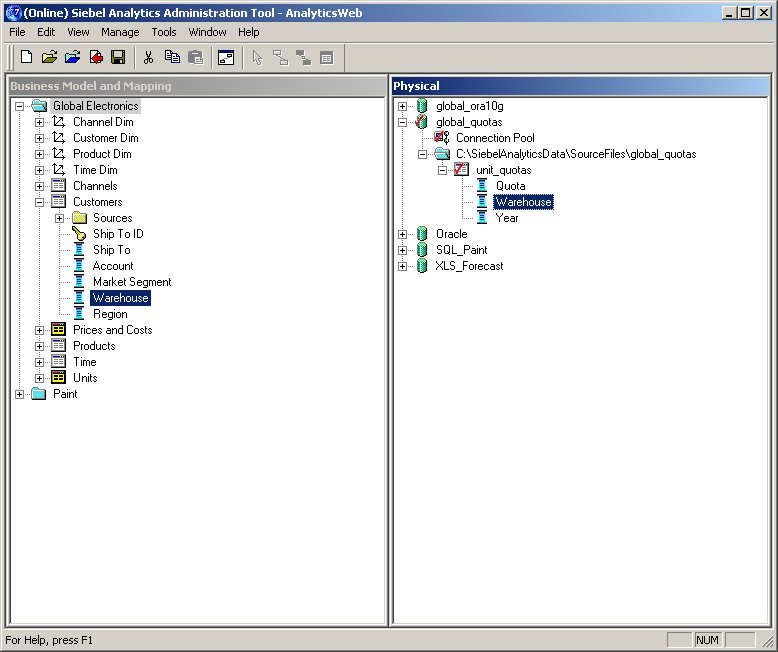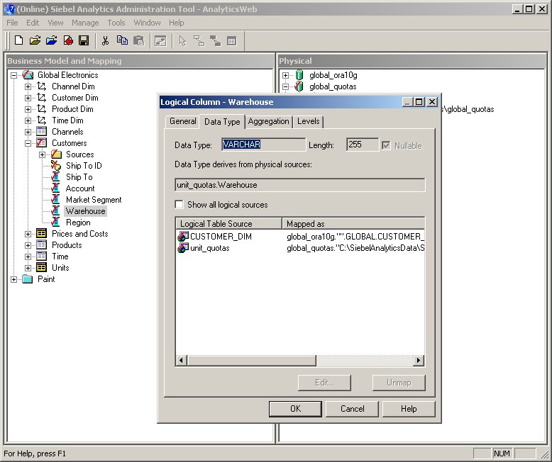 You obviously can't see the dragging there, but I just dragged the physical Warehouse item and dropped it on top of the logical Warehouse item in the Customers folder. This creates two data sources for the one logical item, and effectively "joins" the two data sources on this column. You can see this when you view the properties for the Warehouse item: