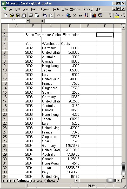 I've also got an Excel spreadsheet, put together by my sales manager, with the sales quota for each Warehouse for 2002, 2003 and 2004. Ideally, I'd like to make this quota information available in Answers, reading directly from the spreadsheet but integrated in with the other measures in the Units fact table. The spreadsheet looks like this: