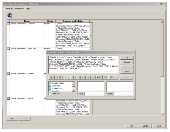 and then add a security filter for each dimension table, that refers to the dimname_LEVEL column in each logical table and ensures we pick up data for the correct level of aggregation within each dimension. When it comes to retrieving data from the analytic workspace, the BI Server will now simply select the "cells" or "rows" it wants from the aggregate data, without having to worry about performing the aggregation itself.