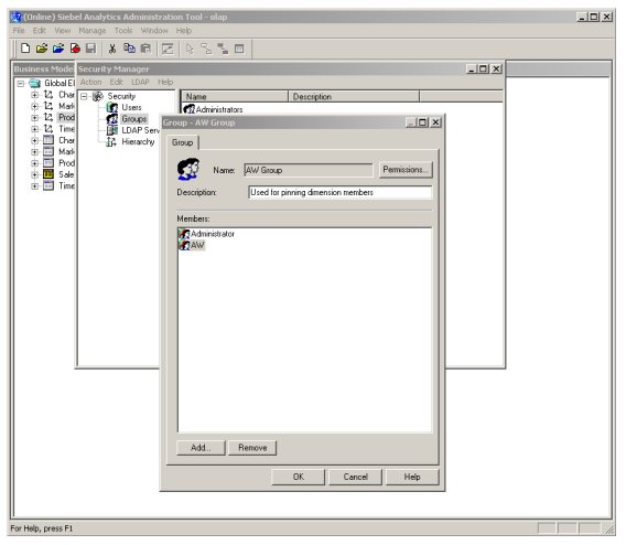 Now comes the final step. We are going to use a feature in the BI Server, not unlike Virtual Private Database in the Oracle database, to append additional conditions to the 'WHERE' clause in order to leverage the aggregations in our analytic workspace. To do this, I create a group called "AW" using the Security Manager, like this: