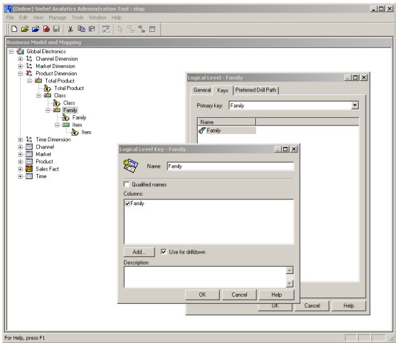 The next step is to create the dimension objects in the Business Layer. Dimension objects in BI Suite Enterprise Edition define drill paths and aggregations, and I can go ahead and create them just as I would over normal, relational tables. For example, to define the Product dimension, I go ahead and create Total Product, Family, Class and Item levels, and then drag the relevant description columns from the Product logical table to create the keys.