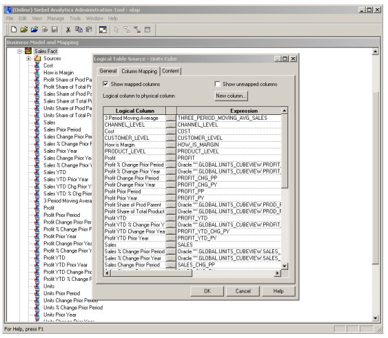 Once I've worked through the Product, Customer, Time and Channel dimensions, I define the Units fact table using just a single logical table source, the Units_Cubeview I used for the dimension logical tables earlier. This time I don't need to define more than one source for the table - this was only because I needed to create a source for each level of the dimensions - and I bring in all of the measures, plus the dimname_LEVEL columns so that the BI Server can retrieve data at the correct level of aggregation.