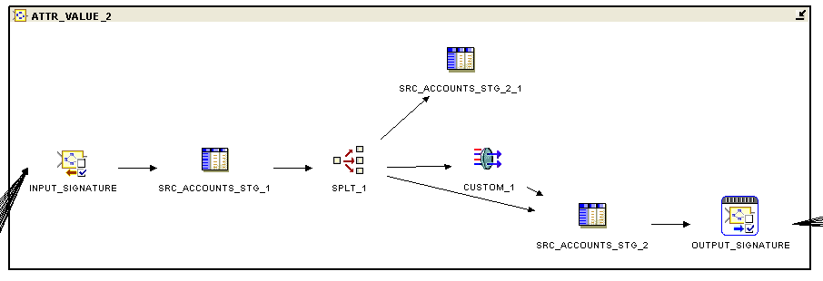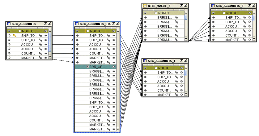 The SRC_ACCOUNTS_1 and SRC_ACCOUNTS_2 tables are in fact aliases for the SRC_ACCOUNTS table within the GLOBAL_STG module, with the valid rows from SRC_ACCOUNTS_STG inserted into the SRC_ACCOUNTS_1 alias, and the records from the error group being passed through the ATTR_VALUE_2 pluggable mapping, corrected, and then inserted into the SRC_ACCOUNTS_2 alias.