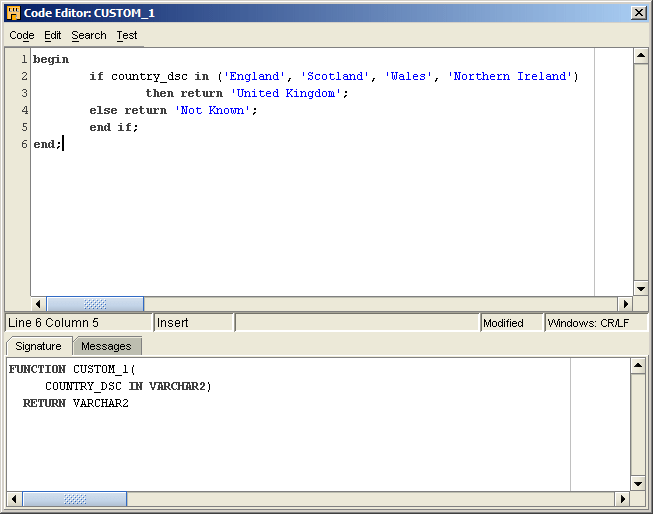 To do this, the code needs to be added to the CUSTOM_1 function, which has COUNTRY_DSC already defined for it as the input parameter. The code used to implement the function is pretty simple and looked like this (remember that only data that needs correction will pass through this, not all records):