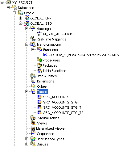 This sub-mapping contains an operator on the left-hand side, SRC_ACCOUNTS_STG_1, which is bound to the SRC_ACCOUNTS_STG_T1 table shown in the project tree earlier, and then splits the rows into two table operators, both of which are bound to the SRC_ACCOUNTS_STG_T2 table, with the second one using the custom PL/SQL transformation we set up earlier to convert all the incorrect country names to correct ones. I'm not sure what the purpose of the split is - I can't see what the split logic is from examining the operator, and both operators are bound to the same physical table. If I work it out later I'll post an update.
