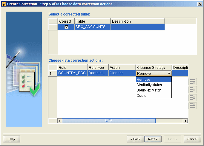 Now comes the interesting bit. Once the data rule has been selected, you need to specify the correction method. To do this, you need to specify two things: the Action (cleanse, ignore, report) and the Cleanse Strategy (remove, similarity match, soundex match and custom).