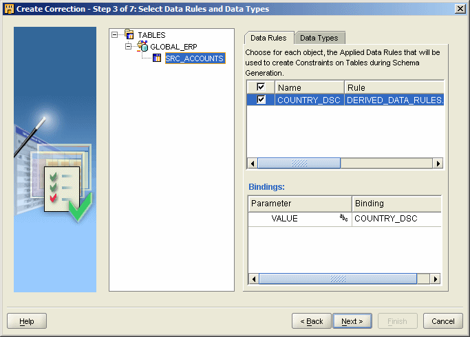 Then, when the table for correction has been selected, you need to select the data rules that will apply to the table of corrected data - this data rule translates to a check constraint on the table that ensures that only values that are allowed by the rule (a.k.a. domain) will be allowed in the column. Note that this check constraint only gets put on the corrected table, not the original source one.