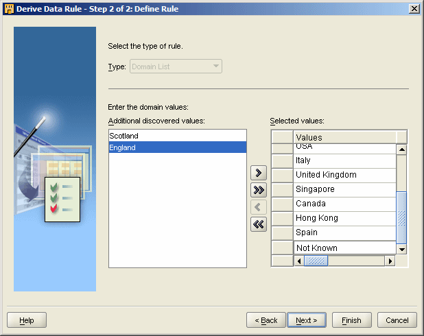 The first step therefore is to make sure the COUNTRY_DSC field is highlighted in the Profile Results Canvas, then press the Derive Data Rule button to put together a candidate data rule based on the domain that the Profiler has detected. You can then deselect those values that you want to be outside of the domain, select those you want to include in it, and add any other values (in my case, "Not Known") that you wish to manually add.