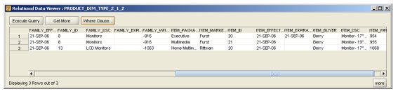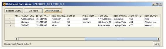 Looking good. Checking the Type 3 dimension gives me the same view. Now if I use the data viewer against the underlying table, I see that it's created a "solved" dimension, where there are additional rows in the table, with negative DIMENSION KEYs, to represent the different higher levels in each hierarchy. This allows Warehouse Builder to create fact tables against any level in the dimension hierarchy, not just the bottom level, which was a restriction in earlier versions of the product.