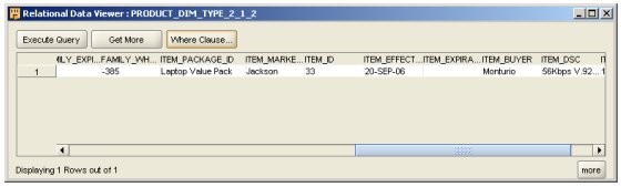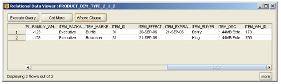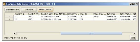 So now we can perform the first load. After running the Type 2 and then Type 3 mappings from the Control Center, I bring up the dimension viewer and take a look at the first run of the Type 2 dimension.