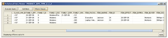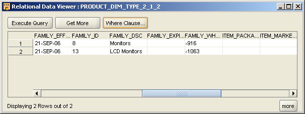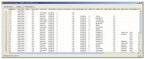 Notice that the effective date attributes for the higher level rows (with a negative DIMENSION_KEY) are only populated for that level and higher, so that for example the rows for the class level only have the CLASS_EFFECTIVE_DATE column filled in, with the FAMILY_EFFECTIVE date and ITEM_EFFECTIVE left blank.