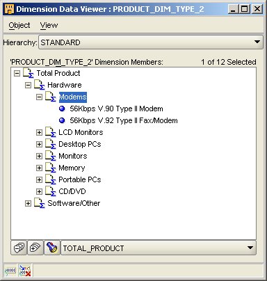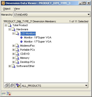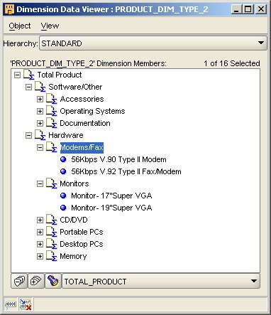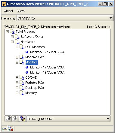 Starting off with the Type 2 dimension, I first check out the dimension object viewer and notice that the entry with Monitor - 17" Super VGA appears in both the new LCD Monitors family and also the old, now redundant, Monitors family. The 19" Monitors one is OK though. What's happened?