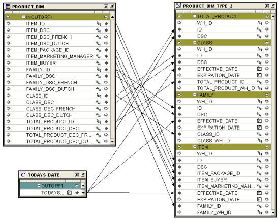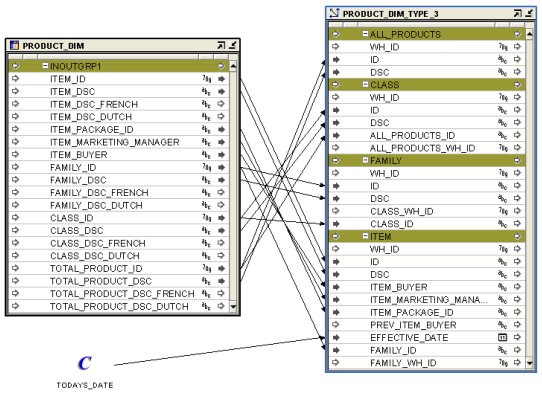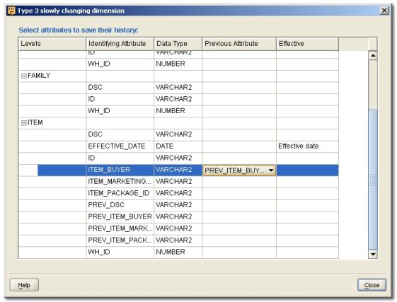 It's similar with the Type 3 mapping. In this case however, there's a new PREVIOUS_ITEM_BUYER attribute that Warehouse Builder maintains automatically (you can't map to it) and an effective date attribute, which you populate as with the Type 2 mapping.