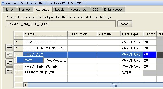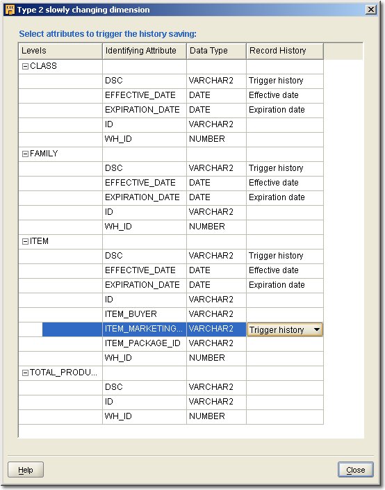 Then, when I view the settings, I can designate the DSC attributes from the Family and Class levels, together with the Item Marketing Manager attribute, as ones that trigger new rows to be written. Through a process of trial and error I established that, if I designate an attribute to trigger history in a level - class or family, in my example - you need to have effective and expiration dates on every level concerned, having these dates just once on each row isn't enough. This is because of the way that OWB creates dimensions such that they can be easily snowflaked - by having creation and expiry dates for each level, you can easily separate them off in to separate tables. When you do this through you'll have to re-bind the dimension to the table to create the additional columns.