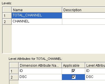Once I've created this dimension, I then create the other Customer and Channel user dimensions, again not using a surrogate key attribute and in these cases, ending up with just two attributes per level, rather than the three (WH_ID, ID and DSC) that I normally have.