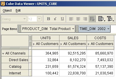 Now the setup is complete, I deploy the dimensions and cube, then the mappings, then run the mappings, and check out the cube in the OWB cube viewer.