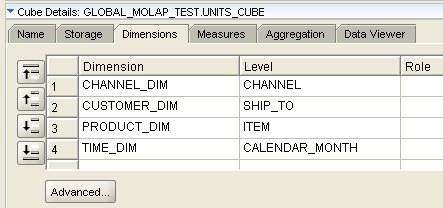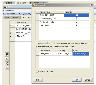 One final point to note with MOLAP storage is that by default, the cubes that OWB sets up for you have no sparsity handling set up - all the dimensions are marked as dense, which contrasts with AWM which makes time dense but leaves everything else sparse. The risk here is that, if you don't know about this feature - sparsity handling is hidden away in the dimension tab of the Data Object Editor under an "Advanced" button, like this: