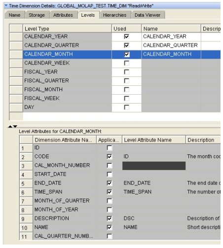 At the end of this step, I end up with a familiar-looking time dimension, with a business key (ID), short description (NAME) and long description (DSC) per level, and none of the additional attributes that OWB is trying to force on me actually implemented for any of the levels.