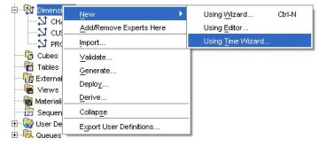 Now as far as I can tell, the only way you can create a dimension of type "Time" using OWB10gR2 is to use the Time Dimension Wizard - if you use the Data Object Editor, I can't find any way of designating the dimension as being a time dimension. So, once I select the wizard from the menu, like this...