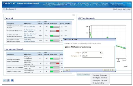 In this example, our BI dashboard provides some insight into the sales trends for one of our products. Normally, if you want to act on this information, you need to change context and switch out to the marketing application; however a feature currently in Siebel Analyics 7.8 allows us to define a link menu that gives the user the ability to perform a range of actions based on the context of the information on the screen. In our case, we simply use this menu to link out to a BPEL process that kicks off a marketing campaign.