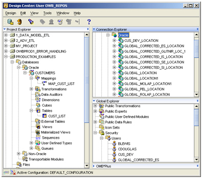 What I want to do now is to migrate this development project to another repository, called OWB_REPOS_PROD. This contains a location called CUS_PROD_LOCATION, which points to another target schema called CUS_PROD. I don't create the database module though, as I want the migration process to do this instead. The production project now looks like this: