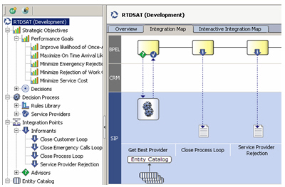 I went throught the basics of a Real-Time Decisions project a few months ago when I worked through the tutorial (there's a much more comprehensive Oracle By Example walk-through now available on OTN), but for the masterclass, I wanted to show how a basic model was built and then interfaced into the world of BPEL and Service-Orientated Architecture. Now I won't go into the full details of the example - you'll have to come to the event for that - but at a high level, we have a BPEL process that assigns contracts to install satellite TV to one of a number of service providers. In the past, contracts were assigned based purely on who could offer the best price; now, we want to incorporate a number of factors, such as whether the supplier did the job once and didn't need to be called back, whether customers rated the supplier well in subsequent customer surveys, whether they commonly reject jobs, and so on. Moreover, we want Real-Time Decisions to use the past history of service provider events - survey scores, work rejections and so on - to predict, with increasing accuracy, which supplier will be most appropriate for a job, with the underlying predictive model getting more and more accurate as we provide it with feedback from the informants.